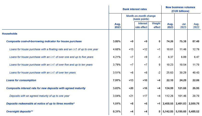 The composite cost-of-borrowing indicator, which combines interest rates on all loans to households for house purchase, increased in August 2023, driven by the interest rate effect. The interest rate on loans for house purchase with a floating rate and an initial rate fixation period of up to one year increased by 13 basis points to 4.68%. The rate on housing loans with an initial rate fixation period of over one and up to five years rose by 7 basis points to 4.21%. The interest rate on loans for house purchase with an initial rate fixation period of over five and up to ten years increased by 7 basis points to 3.79%. The rate on housing loans with an initial rate fixation period of over ten years rose by 6 basis points to 3.51%. In the same period the interest rate on new loans to households for consumption increased by 13 basis points to 7.91%.