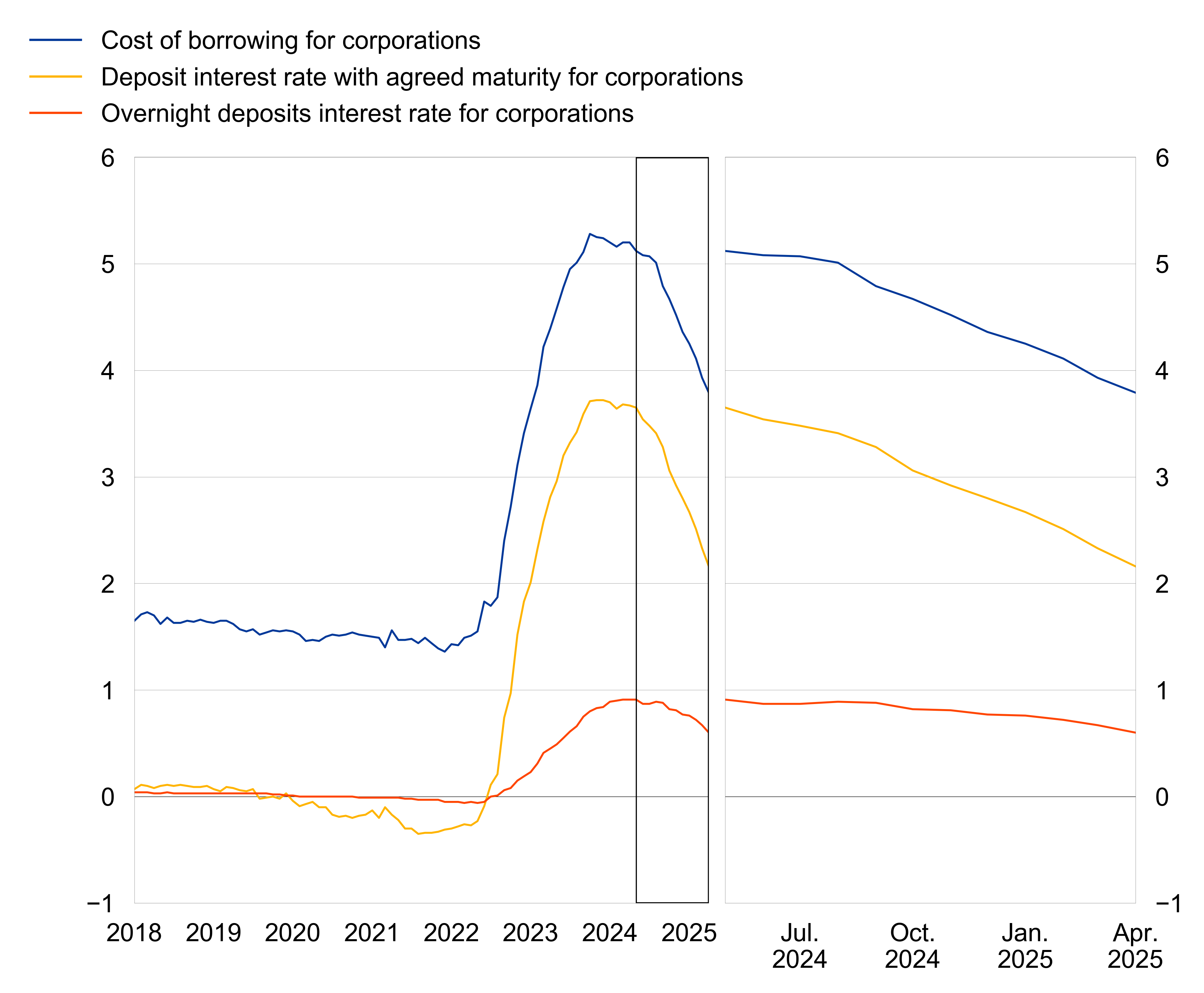 The composite cost-of-borrowing indicator, which combines interest rates on all loans to corporations, decreased in April 2025. The interest rate on new loans of over €1 million with a floating rate and an initial rate fixation period of up to three months decreased by 13 basis points to 3.54%. The rate on new loans of the same size with an initial rate fixation period of over three months and up to one year fell by 27 basis points to 3.51%. The interest rate on new loans of over €1 million with an initial rate fixation period of over ten years remained broadly unchanged at 3.54%. In the case of new loans of up to €250,000 with a floating rate and an initial rate fixation period of up to three months, the average rate charged fell by 12 basis points to 3.90%.