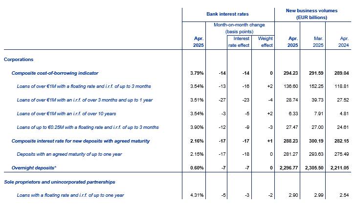 - In addition to monthly euro area bank interest rate statistics for April 2025, this press release incorporates revisions to data for previous periods. Hyperlinks in the main body of the press release lead to data that may change with subsequent releases as a result of revisions. Unless otherwise indicated, these euro area statistics cover the EU Member States that had adopted the euro at the time to which the data relate.