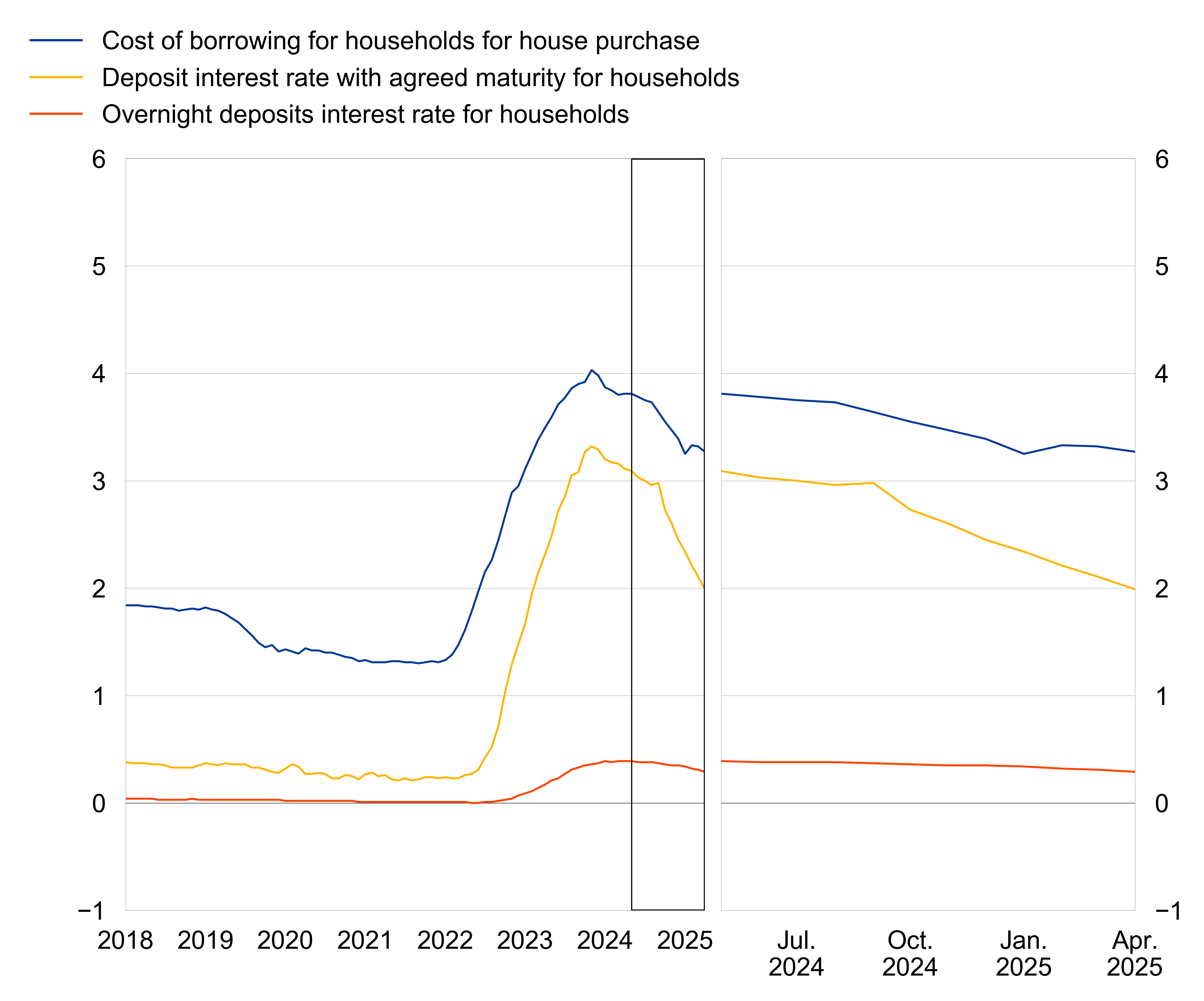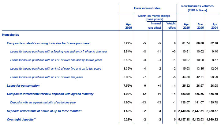 The composite cost-of-borrowing indicator, which combines interest rates on all loans to households for house purchase, decreased in April 2025. The interest rate on loans for house purchase with a floating rate and an initial rate fixation period of up to one year decreased by 8 basis points to 3.84%. The rate on housing loans with an initial rate fixation period of over one and up to five years stayed almost constant at 3.48%. The interest rate on loans for house purchase with an initial rate fixation period of over five and up to ten years decreased by 4 basis points to 3.32%, driven by both the interest rate and the weight effects. The rate on housing loans with an initial rate fixation period of over ten years fell by 7 basis points to 3.03%, mainly driven by the weight effect. In the same period the interest rate on new loans to households for consumption showed no change at 7.52%.