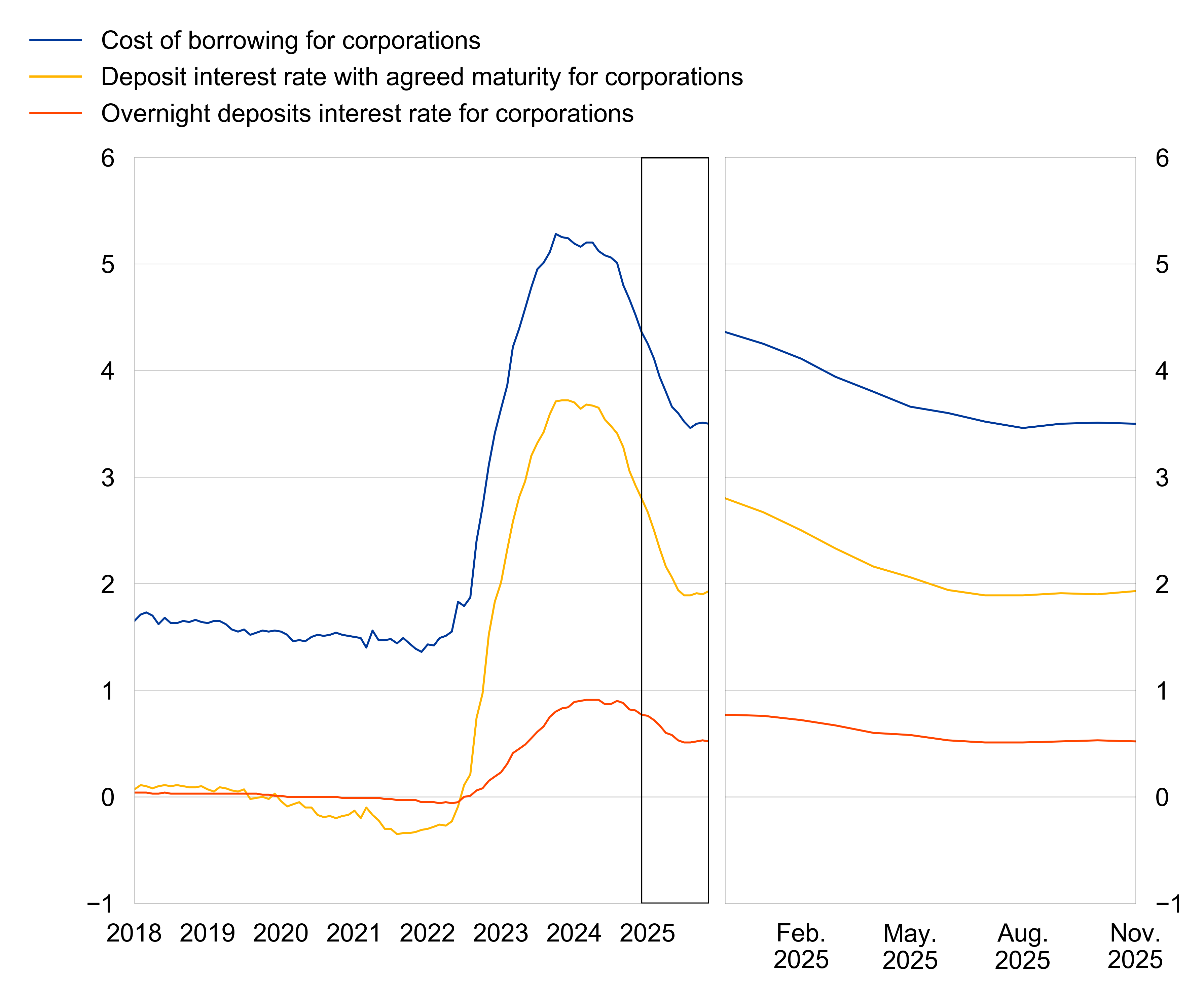 As regards new deposit agreements, the interest rate on deposits from corporations with an agreed maturity of up to one year stayed almost constant at 1.91% in November 2025. The interest rate on overnight deposits from corporations stayed almost constant at 0.52%.