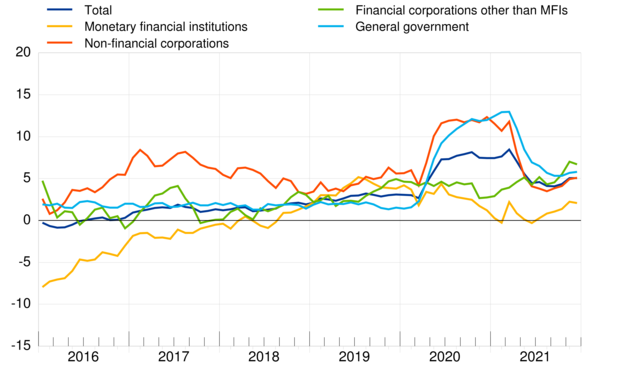- The annual growth rate of the outstanding amount of debt securities issued by euro area residents was 5.0% in December 2021, compared with 5.1% in November.