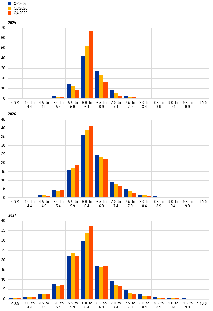 GDP growth expectations stood at 1.2% for 2025, 1.1% for 2026 and 1.4% for 2027 (Chart 6). Compared with the previous round, these figures imply a slight upward revision of 0.1 percentage points for 2025, while the outlook for 2026 and 2027 remained broadly unchanged. The figure for 2025 is in line with the September 2025 ECB staff macroeconomic projections, while the figures for 2026 and 2027 are both 0.1 percentage points higher. The longer-term growth expectations (referring to 2030) were unchanged at 1.3%.