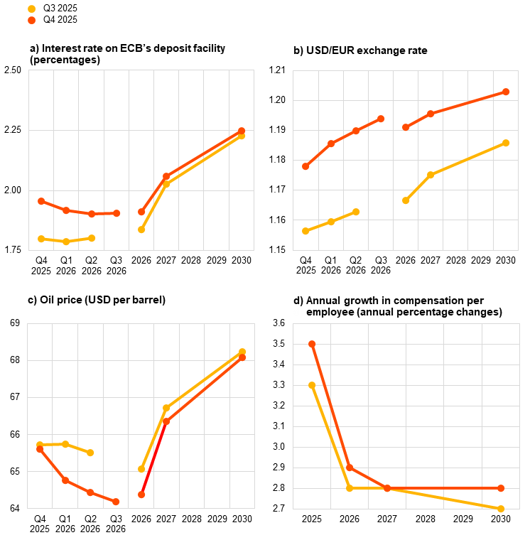 On average, forecasters expected the ECB’s deposit facility rate to stay at around 2.0% in the fourth quarter of 2025 and to decrease, to around 1.9%, in the first quarter of 2026 before increasing to 2.1% by 2027 and further to 2.25% by 2030. They continued to expect the euro to appreciate against the US dollar, from 1.18 in the fourth quarter of 2025 to 1.19 in 2026 and further to 1.20 in 2030, and oil prices to remain around USD 64-68 per barrel from the fourth quarter of 2025 through to 2030. They also expected the growth rate of nominal wages to moderate from 4.5% in 2024 to 3.5% in 2025, 2.9% in 2026 and 2027 and 2.8% in the longer term.