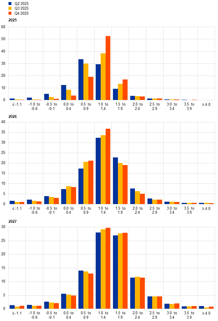 Uncertainty surrounding the medium-term inflation outlook has eased somewhat this round, while the balance of risks was less tilted to the upside.[3],[4] Having eased substantially since the peak of inflation observed around the turn of 2022-23, quantitative indicators of uncertainty surrounding the two-year-ahead inflation outlook eased somewhat further this round, albeit remaining at levels higher than those observed prior to the invasion of Ukraine. The decrease in aggregate uncertainty stems from both lower disagreement between respondents and lower individual uncertainty. The evolution of US tariff policies continued to be mentioned as a source of uncertainty. Aggregate probability distributions for the calendar years 2025, 2026 and 2027 are presented in Chart 2. The balance of risk indicator (showing risks around the baseline expectations) for the two-year-ahead horizon remained positive (to the upside) but less so. According to the qualitative remarks, upside risks to the inflation forecasts stem from geopolitical developments and commodity prices, higher than expected wage growth and stickier core inflation. On the downside, a stronger than expected euro, weaker global demand and possible disinflationary pressures from a redirection of Chinese exports towards the euro area pose risks.