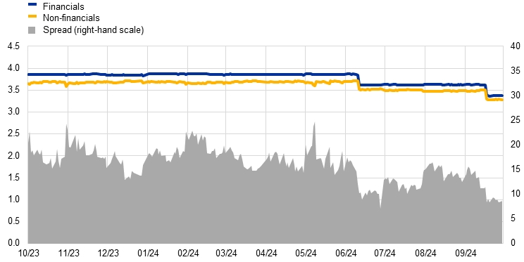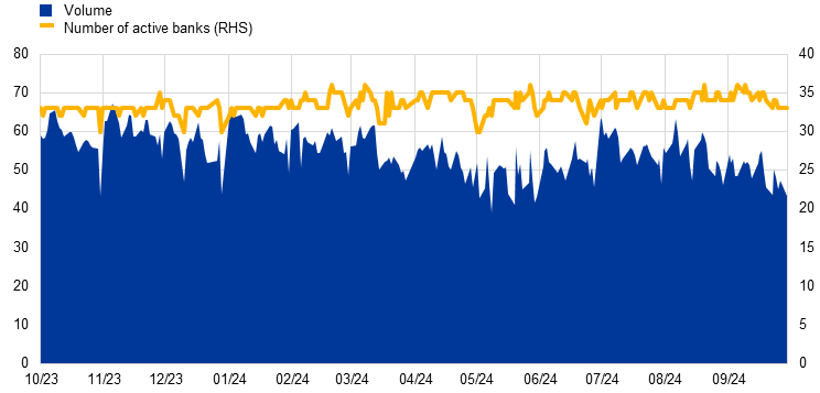 First, the €STR showed a full and immediate pass-through of the ECB’s policy rate changes. The ECB cut its key interest rates twice during the period under review, lowering the deposit facility rate, which is the rate through which the Governing Council steers the monetary policy stance, from 4.0% to 3.5%.[3] Accordingly, the €STR decreased from 3.90% at the beginning of October 2023 to 3.41% at the end of September 2024.