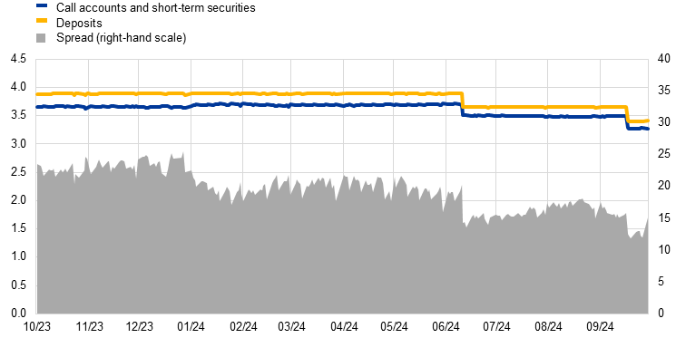 The remuneration of call accounts was on average 19 basis points less favourable than that of deposits over the period under review, versus 17 basis points in the previous year, even if the spread between the two tightened somewhat from June onwards (Chart 12). Call account remuneration continued to adjust more slowly than deposit remuneration to new market conditions, for example when the ECB lowered interest rates.