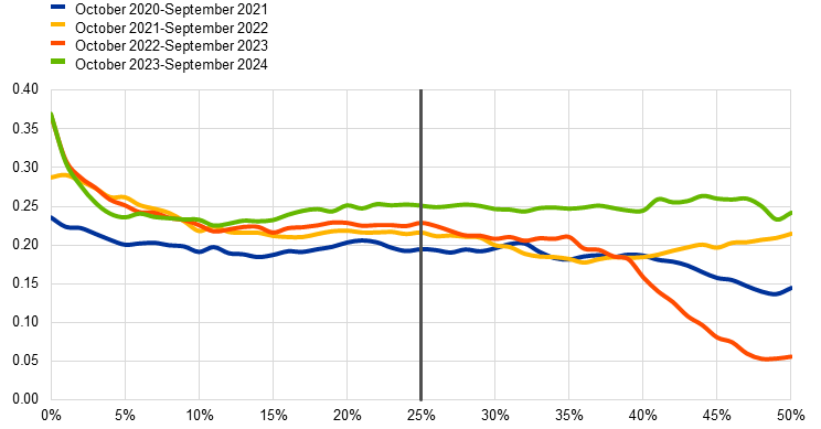 Rate dispersion, measured as the difference between the rates at the 25th and 75th percentiles (i.e. the interquartile range), halved compared with the previous review period, hovering between 3 and 4 basis points. The reduced dispersion was most visible at the 25th percentile, i.e. less transactions priced lower than the average (Chart 2). To recall, during the rapid rate-hiking cycle in 2022 and 2023 banks were able to maintain a wider price range as the shift to positive rates brought new counterparties, some of which were less price-sensitive. However, if lower/higher percentiles are included (the 10th and 90th, for example), price dispersion does not show similar signs of declining and even increases slightly at the end of the period under review, suggesting more idiosyncratic pricing conditions at the extremes of the distribution.
