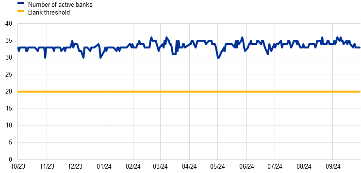In the review period the average number of active banks rose from 32 to 34. For the first time since the start of the €STR the number of banks did not fall below 30 even during holiday periods and at month and quarter-ends (Chart 14, upper panel).