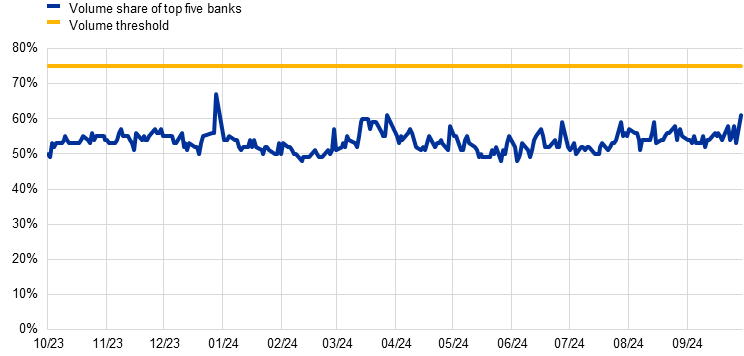 The volume share of the five banks with the largest volume of transactions increased on average to 53%, from 50% in the previous year, although it was below the levels for 2022 and 2021 (55% and 56% respectively). Concentration remained well below the 60% mark observed in the initial calibration of the methodology during the public consultations in 2018 and also the 75% threshold which would trigger a contingency computation.