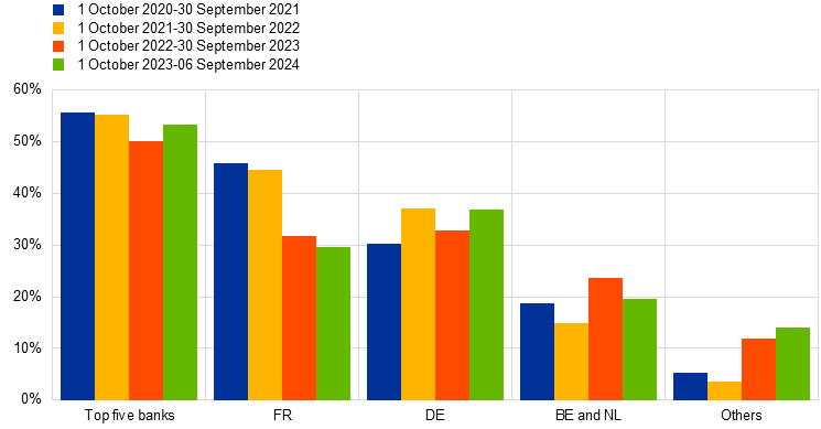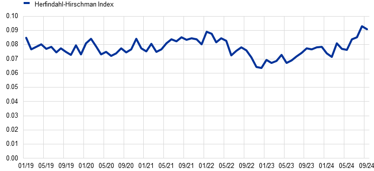 The concentration metric for the top five banks remained significantly below the 75% threshold and hovered at around 53%, compared with around 50% in the previous review period (Chart 14, lower panel).