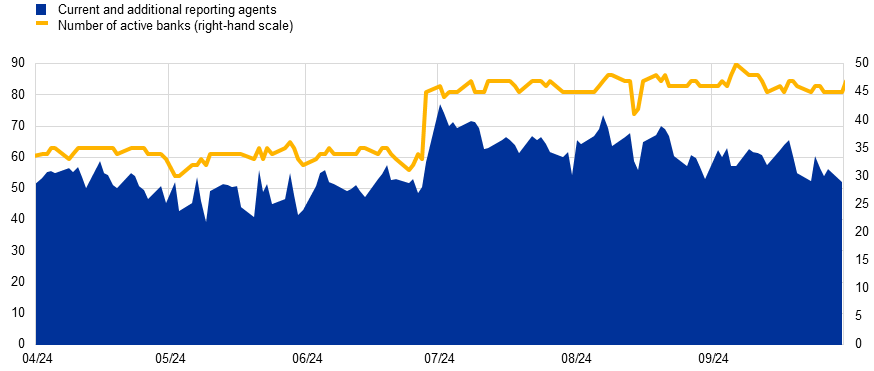 Since 1 July 2024 24 new banks have joined the institutions contributing to the MMSR data collection, on which the €STR is built.[5] The data are now collected from 69 reporting banks from 12 countries, including for the first time Luxembourg and Portugal.