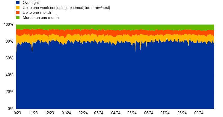 In absolute terms, the volume of overnight borrowing in the MMSR data averaged €173 billion in the review period, markedly higher than the €145 billion recorded in the previous review period, suggesting that the overnight segment remained the maturity of choice after the peak of the rate-hiking cycle.